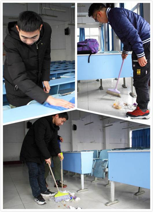 中午12:00,志愿者们在一、二教学楼间的广场集合完毕,携带铁铲、抹布、清洁球、水桶、扫帚、拖把等清理工具,对教室课桌上的乱贴乱画现象、教室地面的垃圾纸屑及楼道的乱堆乱放进行了清理;活动过程中,志愿者们分工协作、相互配合,经过近两个小时的忙碌,教室、楼道面貌焕然一新。