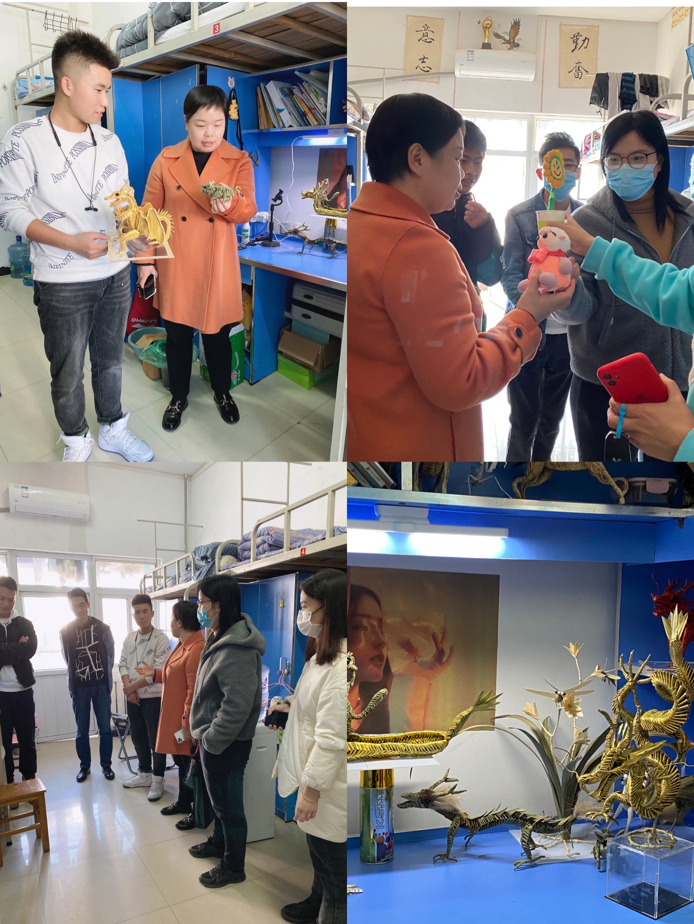 在检查过程中,倪凰与在寝学生亲切交谈、详细询问了学生的生活、学习情况,各个部门的领导听取了学生反映的住宿和学习问题,同时叮嘱学生们寝室的用电安全,以及最近广泛宣传的有关防范电信诈骗注意事项。当检查组走进524寝室时,被一排精美的手工艺品深深吸引,据了解,这是冉崇军同学通过课余时间进行的非物质文化遗产作品创作,该同学表示希望通过自己的业余爱好,把“棕编”这项非物质文化遗产发扬光大,带动身边的同学一起了解我们国家深厚的文化底蕴。崔海英勉励同学们向冉崇军看齐,在保证完成基本学业的情况下发展业余爱好,并且将个人爱好与家国情怀融合。