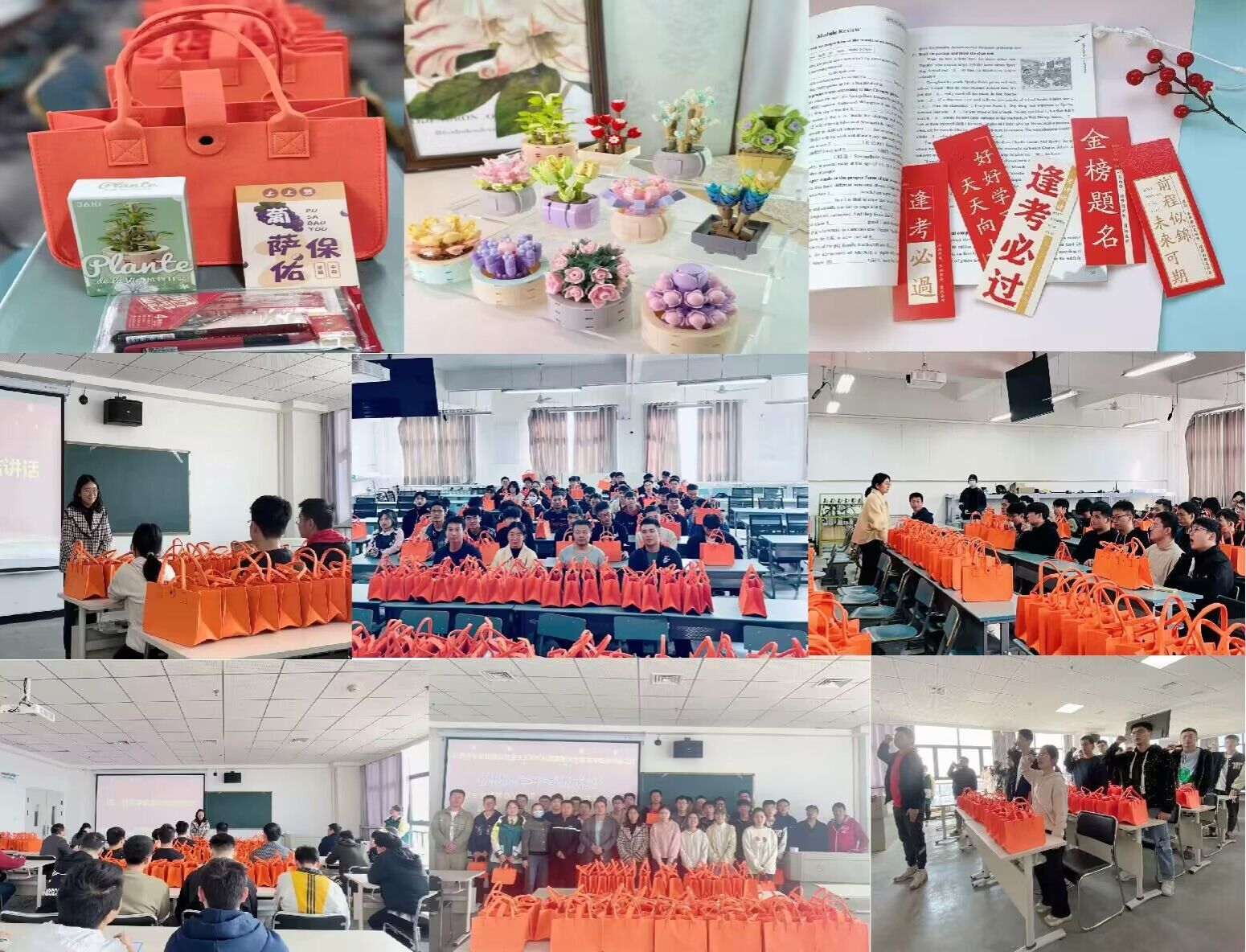 最后,老师们为考研学子送上学院精心准备的考研“加油包”,包含寓意 “一战成硕”的橙色毛毡小包、考研幸运签(书签)、积多好运株(多肉积木)、一战成硕笔(文具套装)等物品,希望同学们在紧张的复习阶段,能够及时调整心态,以最好的状态备战考研。件件贴心的礼物,句句真切的话语,满载着对考研学子诚挚的鼓励与祝福。