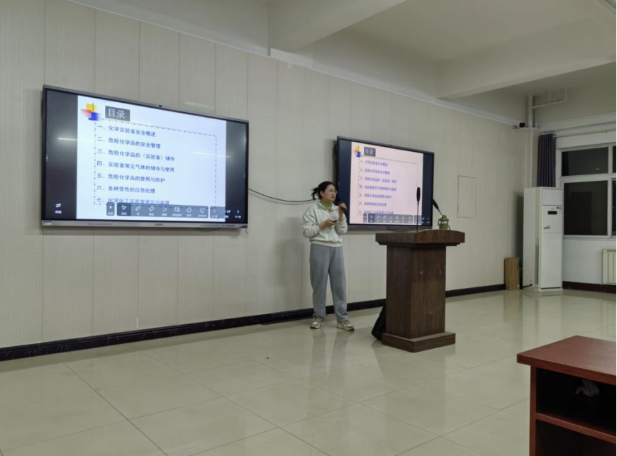 首先欧阳丽霞老师向同学们详细讲解了化学实验室安全概述,然后从危险化学品的管理、储存、使用、防护等方面进行了详细地解读。