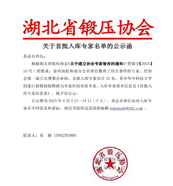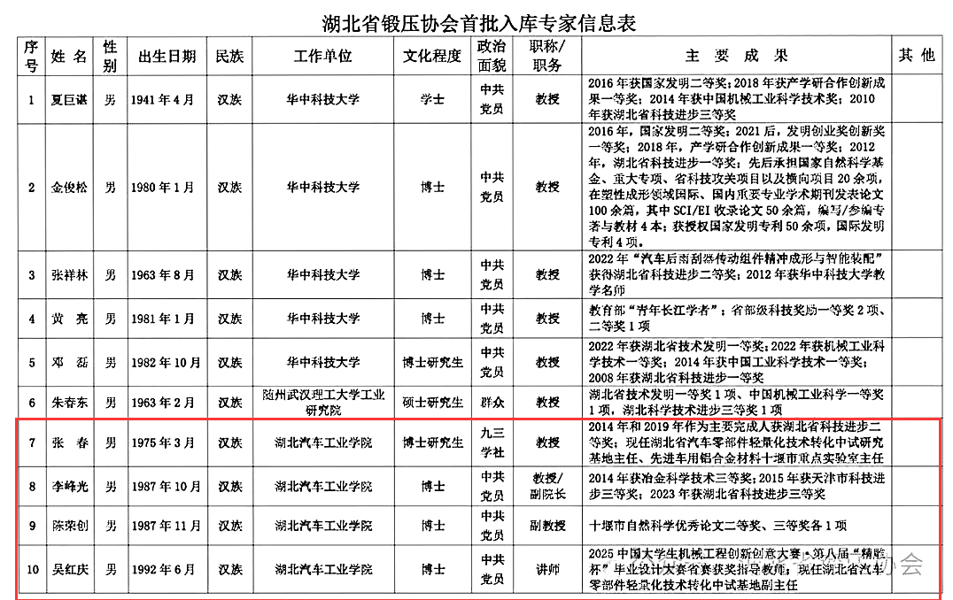 近日,湖北省锻压协会发布《关于首批入库专家名单的通知》,167net必赢李峰光教授、张春教授、陈荣创副教授,吴红庆博士4位教师入选湖北省锻压协会首批专家智库。