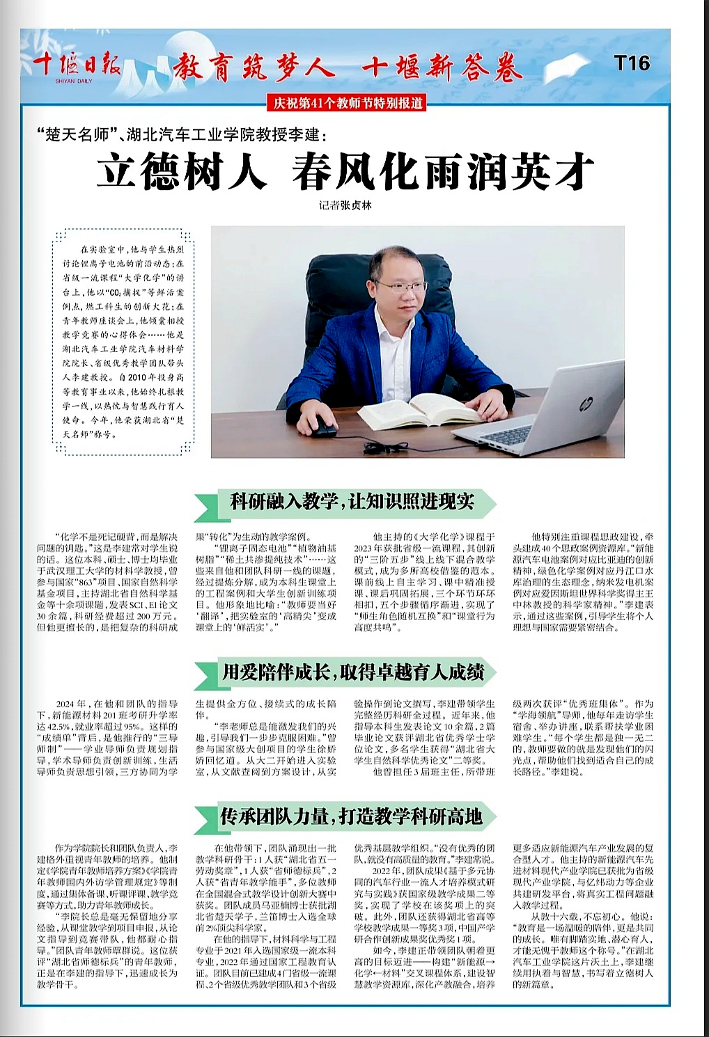 如今,李建正带领团队朝着更高的目标迈进——构建“新能源→化学←材料”交叉课程体系,建设智慧教学资源库,深化产教融合,培养更多适应新能源汽车产业发展的复合型人才。他主持的新能源汽车先进材料现代产业学院已获批为省级现代产业学院,与亿纬动力等企业共建研发平台,将真实工程问题融入教学过程。