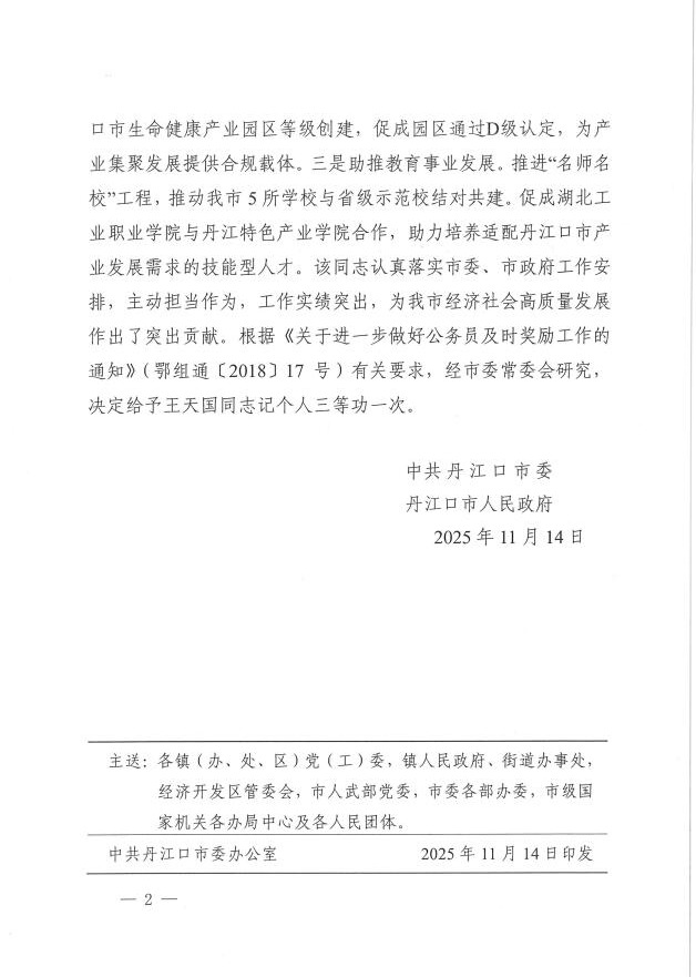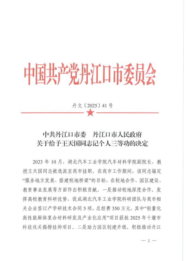 王天国同志此次获表彰,充分体现了学校干部队伍较强的专业素养和实干担当精神。学校将持续完善挂职工作机制,鼓励更多干部教师主动融入区域发展大局,在实践锻炼中提升能力、贡献力量,为湖北加快建成中部地区崛起重要战略支点、十堰建设鄂西区域中心城市作出更大贡献。(审稿/王镇)(文章来源:167net必赢,必赢手机app官网)
