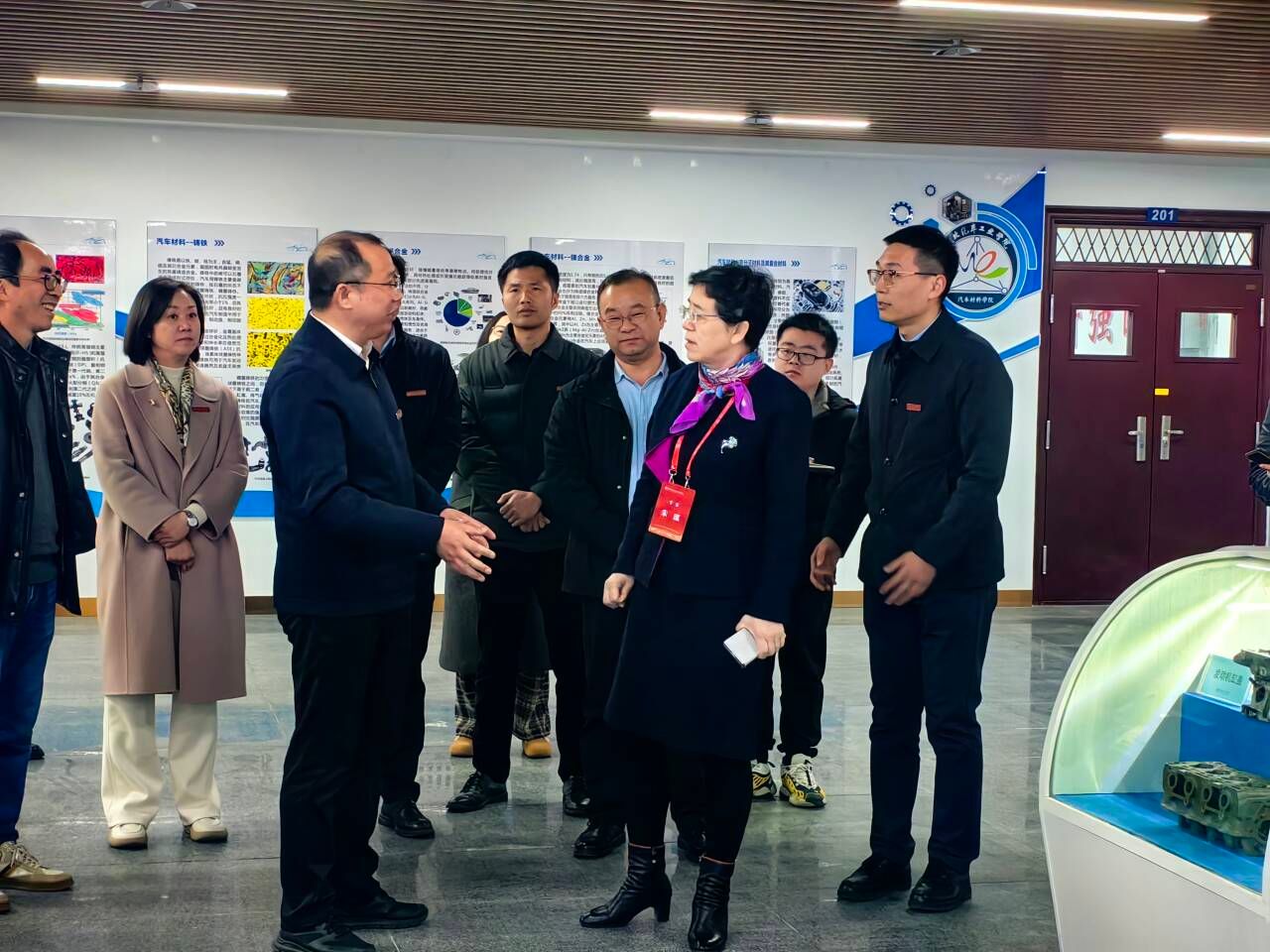 朱泓教授一行首先考察了学院实践教学条件。张春教授介绍了湖北汽车零部件轻量化技术转化中试基地的基本情况,重点阐述了学院教师如何将前沿科研成果融入教学实践,反哺本科人才培养,有效提升学生的工程实践能力与创新意识。杨伟老师汇报了激光加工创新中心的软硬件配置,以及在工程实践、毕业设计、大学生创新实验、学科竞赛和科学研究等方面的开展成效。王金凤教授介绍了先进连接研究中心的发展历程与建设成果,及其在支撑学科建设与人才培养方面发挥的重要作用。顿亚鹏老师讲解了汽车材料及制造工艺展厅的整体布局,并结合汽车典型零部件展示了学院在实践教学与人才培养中的具体做法。