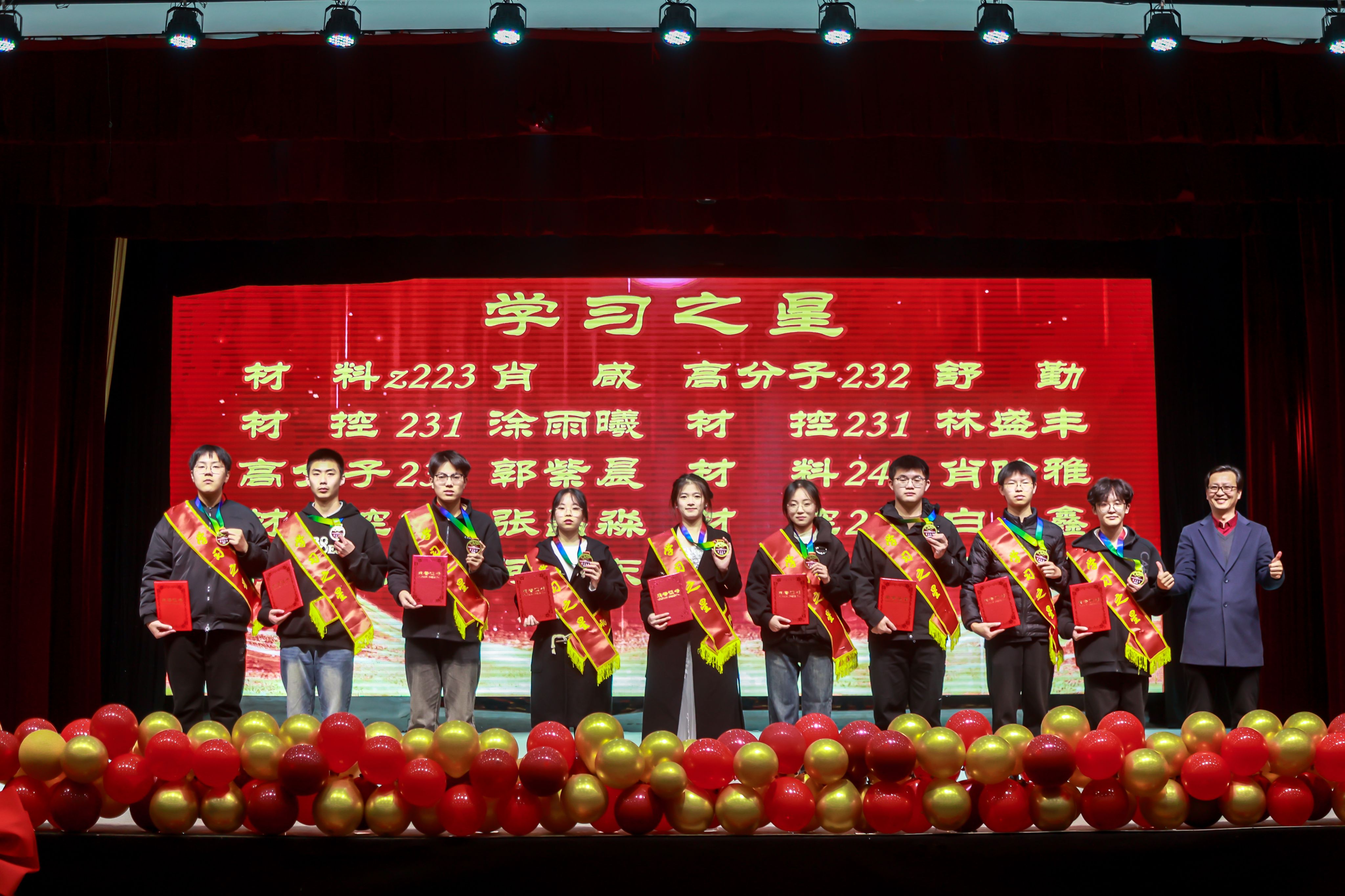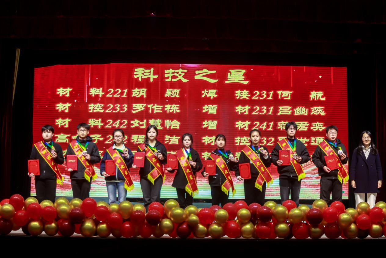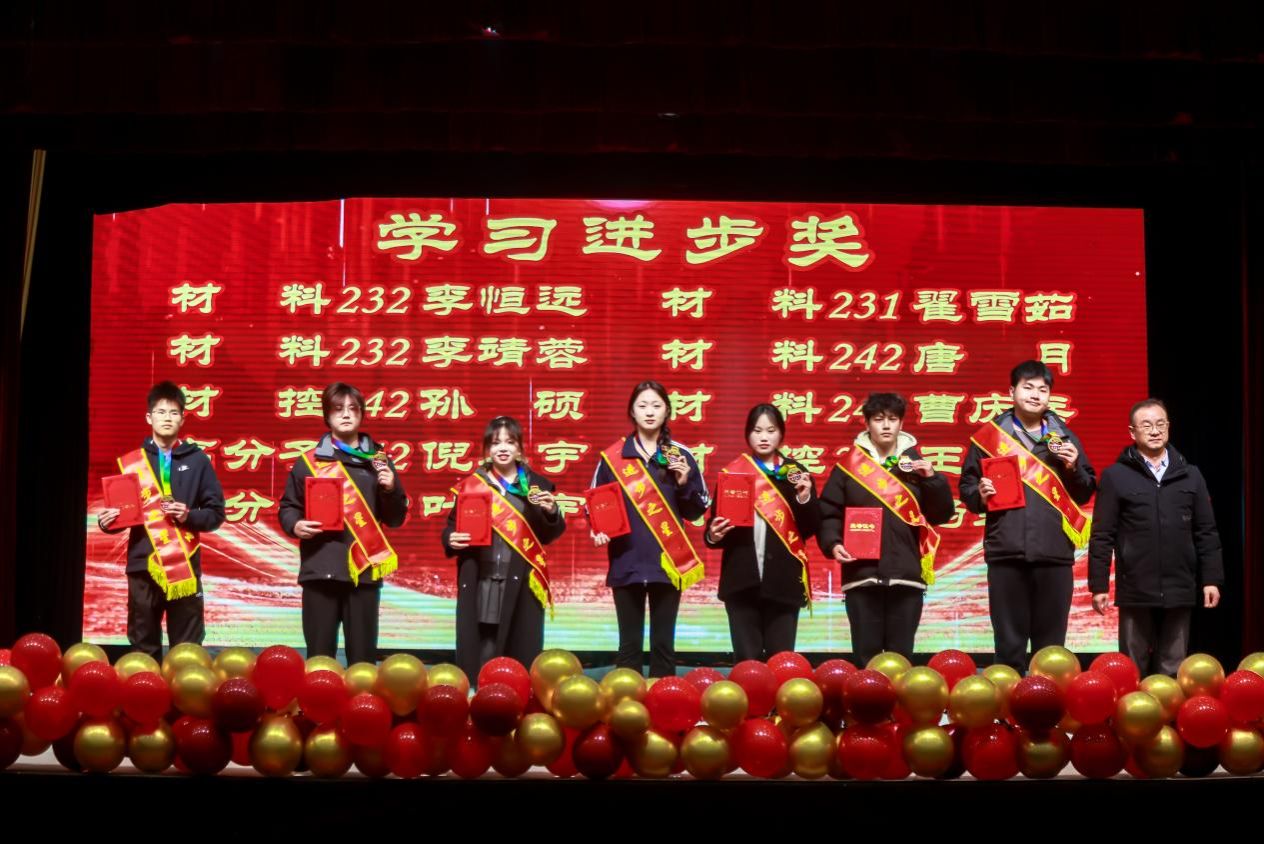 大会伊始,学院对第七届“我爱材料之无限畅想”杯彩色金相“征诗配画”大赛获奖代表予以表彰;10名“学习之星”、10名“科技之星”、12名“学习进步奖”、2名“单科满分”及8名“优秀导生”依次登台受奖;2025年暑期社会实践优秀团队、学科竞赛优秀团队及优良学风班、学习型宿舍也收获表彰,榜样力量激励着全体学子笃行不怠。