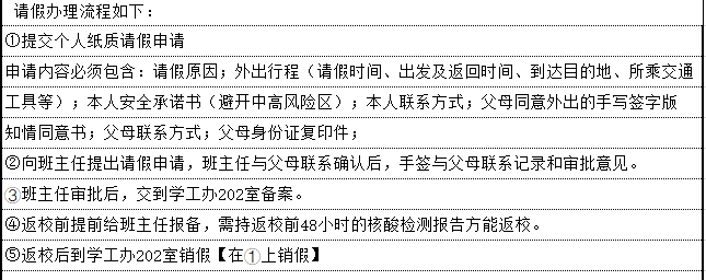 2、“非必要不外出”“非必要不离堰”“外出必报备”制度贯彻执行。国庆放假期间按照“减少人员流动”的防控原则,不允许离校、离堰,确因病、因故、因事需要外出的,一天之内必须在辅导猫上请假;一天以上必须在本班班主任处办理请假手续,并严格履行请销假制度,外出时尽量不去人流量大的地方活动,严禁前往、经停中高风险地区;离堰学生返校时需持48h内核酸检测阴性证明,方可返堰返校。凡学生未经批准私自外出发生中高风险地区旅居史的,学校将根据校纪校规给与严肃处分,同时学生需自行承担隔离观察等相关后果,严禁瞒报、漏报、谎报、错报。