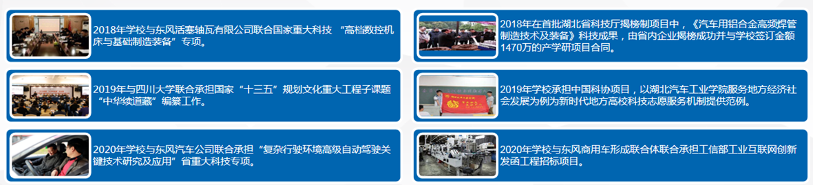 学校设有汽车动力传动与电子控制湖北省重点实验室等31个省部级科技创新平台。近三年,学校承担国家科技重大专项项目、国家自然科学基金、国家社会科学基金等国家级项目15项,工信部工业互联网创新发展工程项目、教育部项目、省重大科技创新计划、省揭榜制项目等省部级项目近200项,市厅级项目210余项。