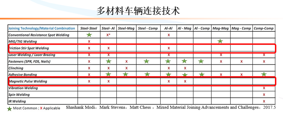 由钢、铝合金、镁合金及碳纤强化复合材料组成的新一代车辆,连接技术是一个关键,尽管紧固与粘接技术可以解决所有材料的连接,但对于技术要求较高的一些结构零部件,特别是底盘部件,其依然不能解决或可靠性、稳定性不足,同时成本较高,因此寻求高可靠性及稳定性,同时兼顾成本效率的连接方法是多材料车辆必须面对的问题,其中搅拌摩擦焊(FSW)与磁脉冲焊(EMPT)因其不同于高温熔化焊接的低温固相焊接机理,因而具有高可靠性与稳定性且成本低效率高,特别是可以焊接或连接异种材料,成为异种和同种材料连接的重要技术手段。