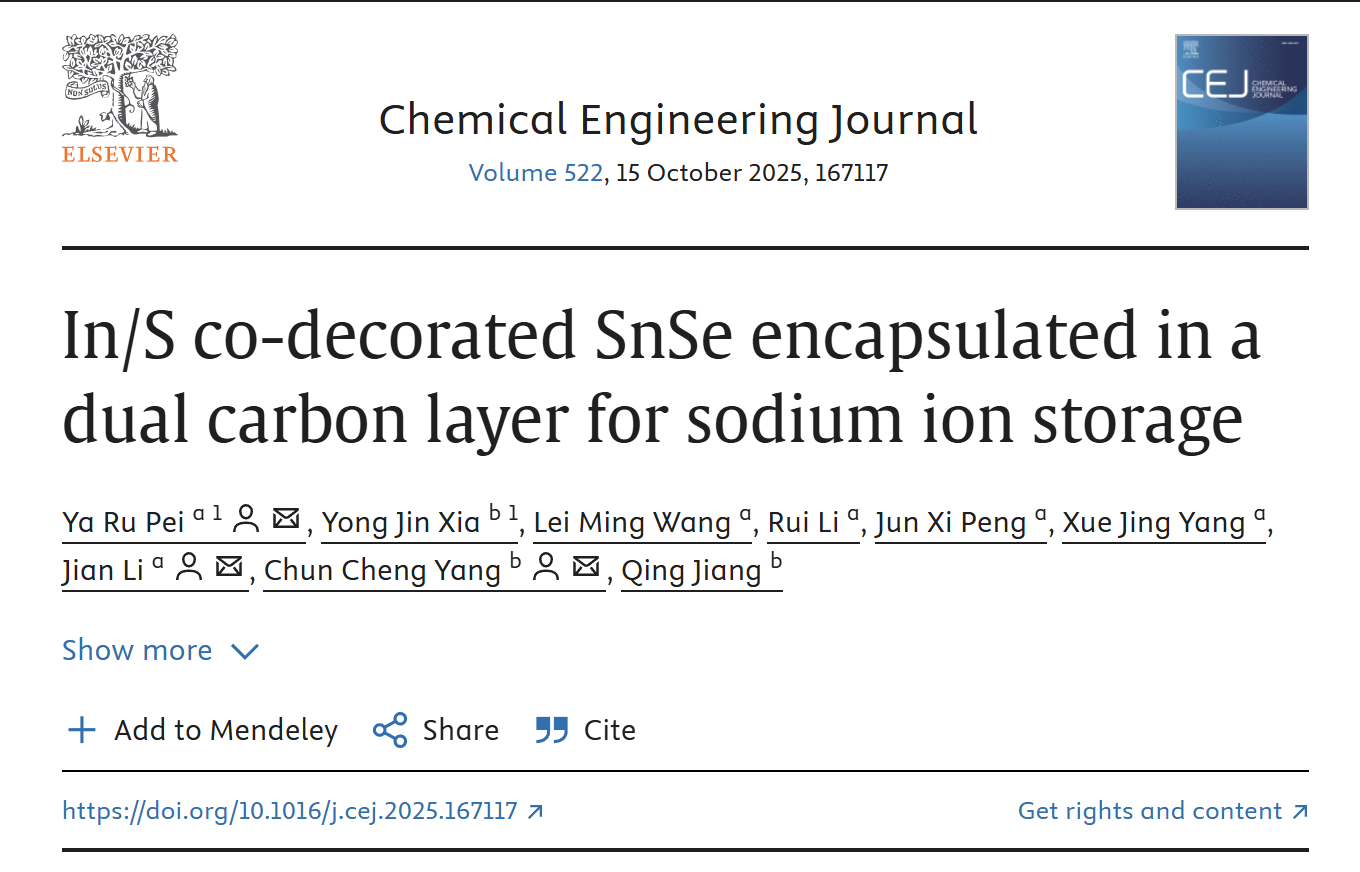 近日,167net必赢青年教师裴亚茹博士和吉林大学蒋青、杨春成教授团队在期刊《Chemical Engineering Journal》(中科院一区TOP期刊,2025年影响因子13.2)发表题为“In/S co-decorated SnSe encapsulated in a dual carbon layer for sodium ion storage”的研究论文。