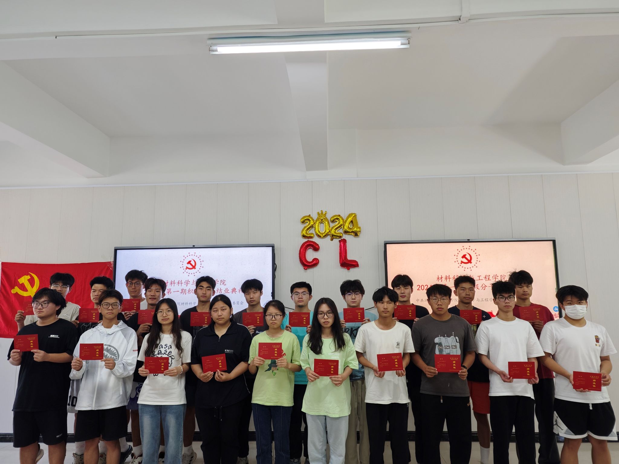 2024年5月20日,材料学院2024年第一期入党积极分子结业典礼在材料实验楼303顺利举行,出席本次典礼的老师有材料学院学生党支部书记詹韩琼、材料学院辅导员李诗、王誉翔、李志强、学生支部成员及新一期入党积极分子。