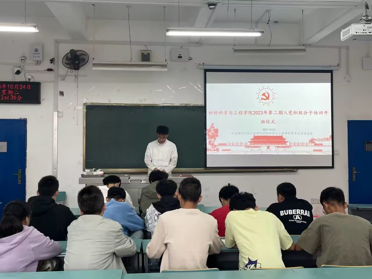 为了深入贯彻落实新时代党的建设总要求,进一步提高入党积极分子、发展对象和预备党员政治素养,做好党员发展和教育工作,10月26日中午,材料学院2023年第二期入党积极分子培训班、发展对象培训班、预备党员培训班开班典礼暨第一次党课在6201教室顺利举行。材料学院学生党支部书记詹韩琼,学生党支部支委会成员及入党积极分子、发展对象和预备党员参加了本次大会,会议由詹韩琼主持。