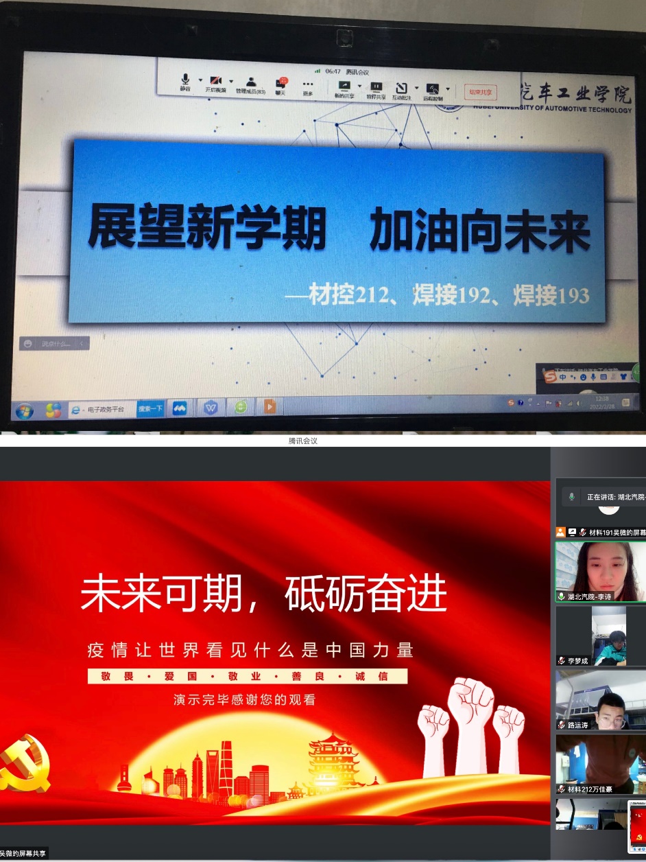 为深入贯彻关于组织开展2022年春季学期“开学第一课”主题班(团)会的通知,进一步做好开学后学风建设、疫情防控、思政教育和安全教育等工作,材料学院各班级积极组织“展望新学期,加油向未来”主题班(团)会。