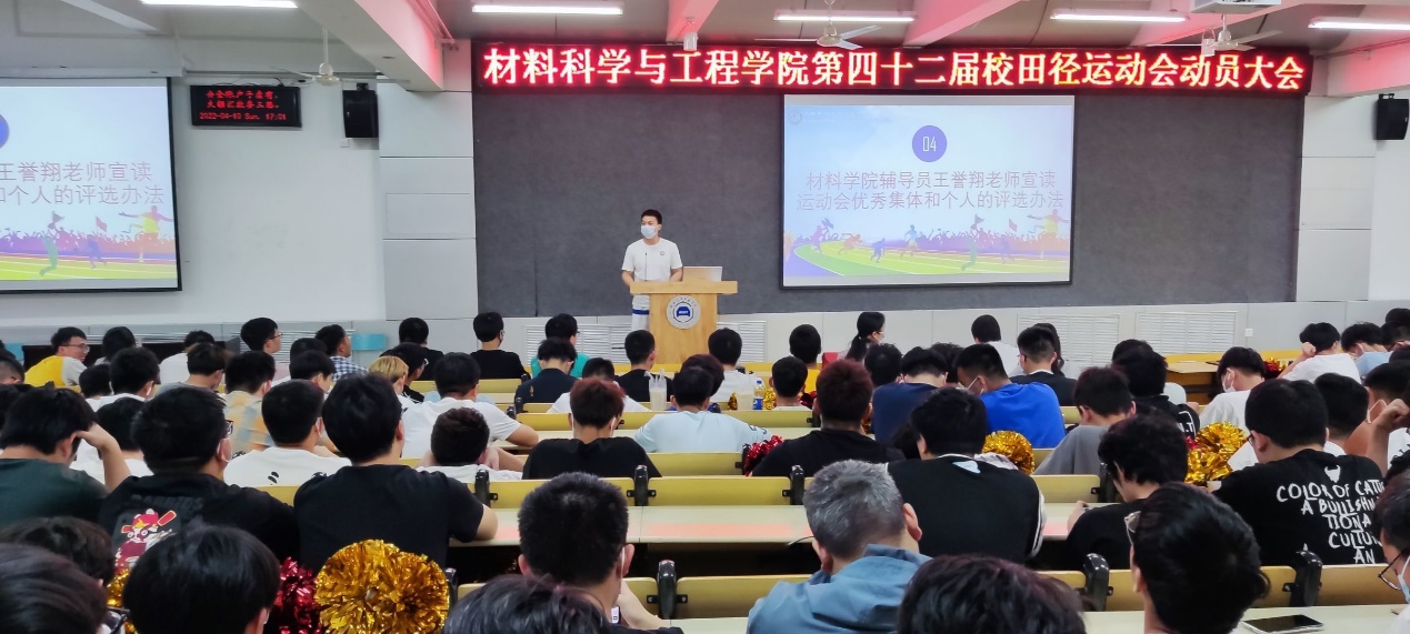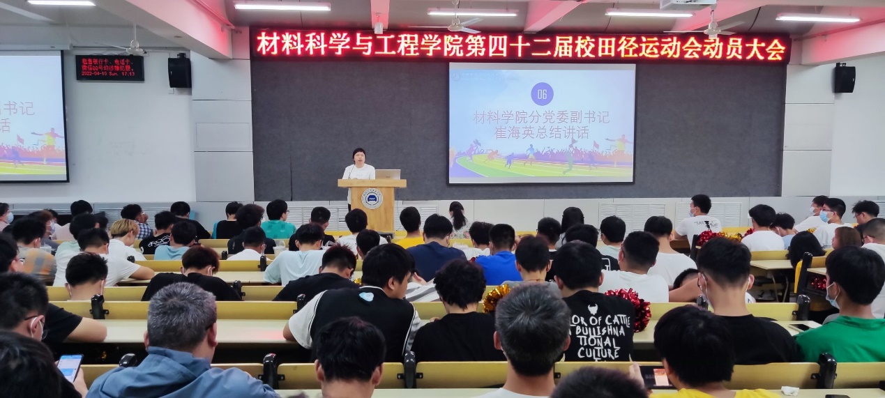 春和景明,万物复苏,我们迎来了167net必赢,必赢手机app第四十二届春季田径运动会。这是一个展现青春与活力的盛会,更是一个展现167net必赢学子风采、表现167net必赢强大凝聚力的机会。4月10日晚上16:30,材料科学与工程学院在6113教室开展第四十二届校田径运动会动员大会,材料学院分党委副书记崔海英、学工办全体辅导员、全体运动员, 21级同学,21级全体导生,20级、19级班长团支书,全体学生会中层干部参与了此次大会,会议由吴延迪主持。