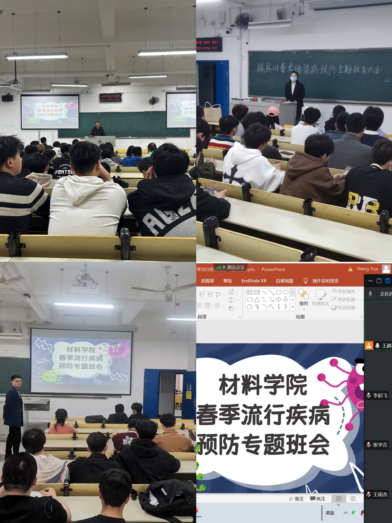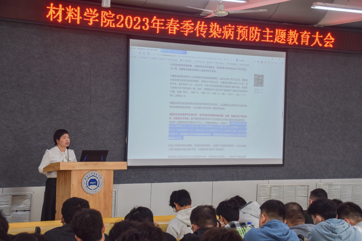 年春季传染病预防主题教育大会和专题班会的形式,在全院广泛进行预防甲流知识宣讲,材料学院全体师生参加了各项会议。
