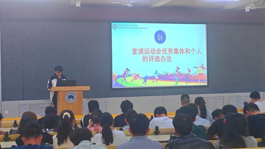 学生会主席姜知远宣读材料学院校运动会优秀集体和个人评选办法,对运动会前期的准备工作和训练任务进行了详细的安排部署,强调了需要注意的事项;全体同学起立宣誓:遵守比赛纪律,听从指挥,服从裁判,拼搏进取,赛出风格,赛出水平,赛出成绩,做优秀材院人。