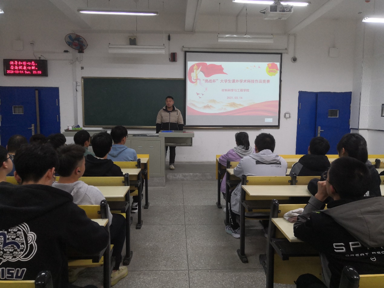 为更好地指导学生备赛第十七届“挑战杯”全国大学生课外学术科技作品竞赛, 争取更多的奖项,3月14日晚上,材料学院在6315教室举行了第十七届“挑战杯”竞赛作品选题评审答辩会。院分团委书记骆无思及学院“挑战杯”工作领导小组导师团成员共5名专家担任了本次答辩会的评委,学院共有16项作品参加了评审答辩会。