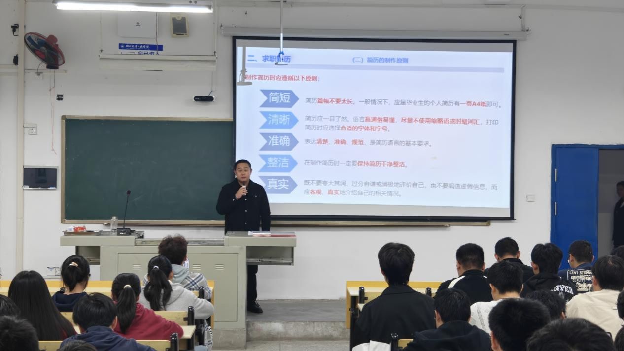 在心得分享环节,骆老师结合往届学生求职案例,鼓励同学们提前梳理大学经历,围绕职业目标打磨简历,同时提醒大家注重简历真实性,通过实习实践积累求职竞争力;互动提问环节,同学们就“跨专业求职简历如何突出优势”“实习经历较少如何弥补”等问题积极提问,骆老师逐一耐心解答,现场氛围热烈。