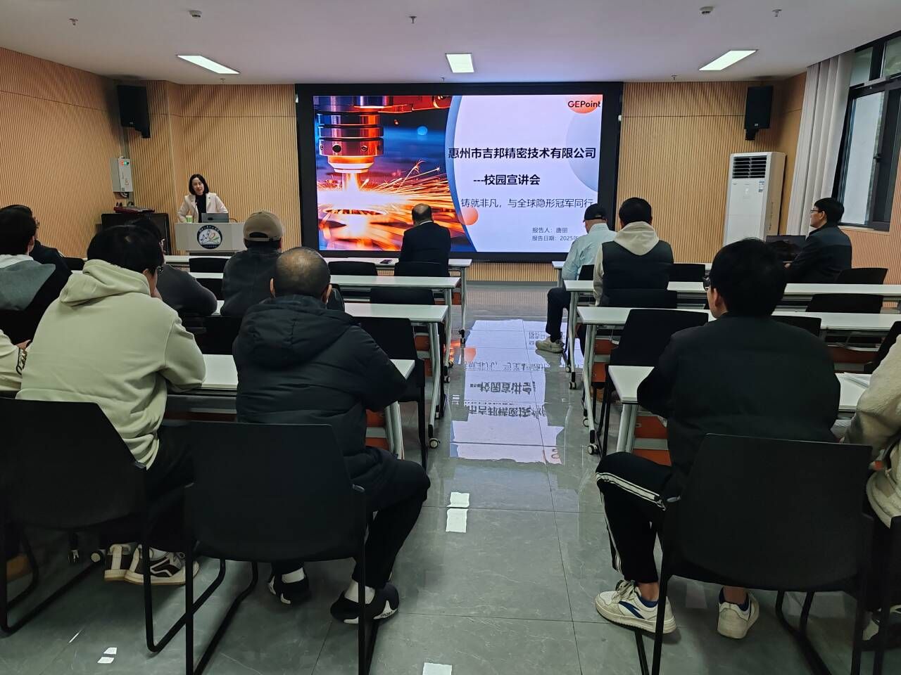 宣讲会上,企业人力资源总监通过PPT演示与视频播放,全面介绍了公司发展历程、行业地位、核心业务及未来规划。作为精密制造领域的骨干企业,惠州吉邦深耕汽车零部件、电子精密组件等领域,拥有先进的生产设备与完善的研发体系,与多家行业龙头企业保持深度合作,发展潜力十足。