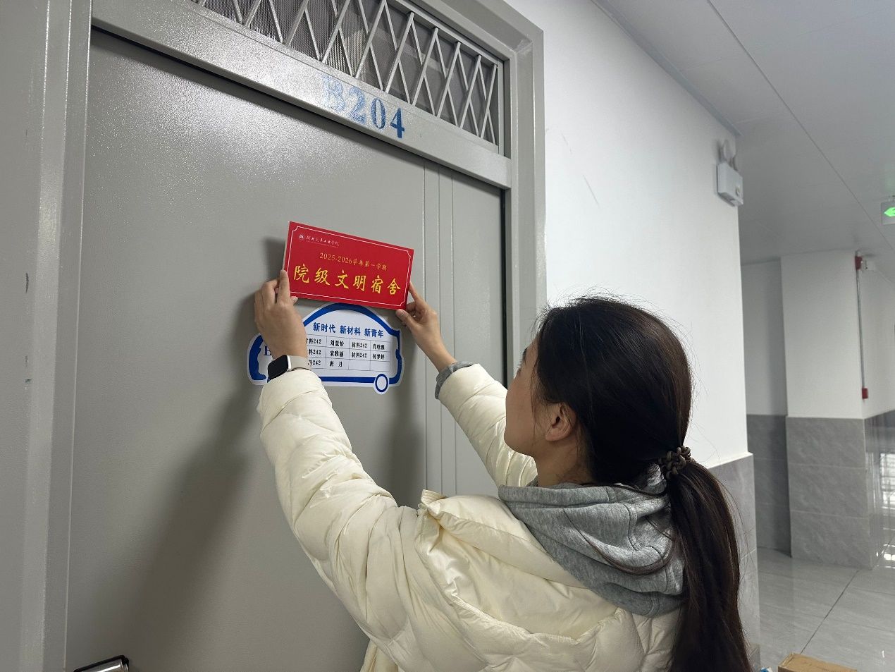 活动现场,老师们带着崭新的“文明宿舍”牌匾走进各个获评寝室,亲手将牌匾悬挂在宿舍门口。醒目亮眼的牌匾不仅是一份荣誉象征,更是对宿舍成员同心协力营造优良住宿环境的肯定。面对这份荣誉,获评宿舍的同学们纷纷表示,会把这份认可转化为持续进步的动力,在保持内务整洁、严守安全纪律的基础上,进一步打磨学风建设与文化建设,主动与其他宿舍分享管理经验。
