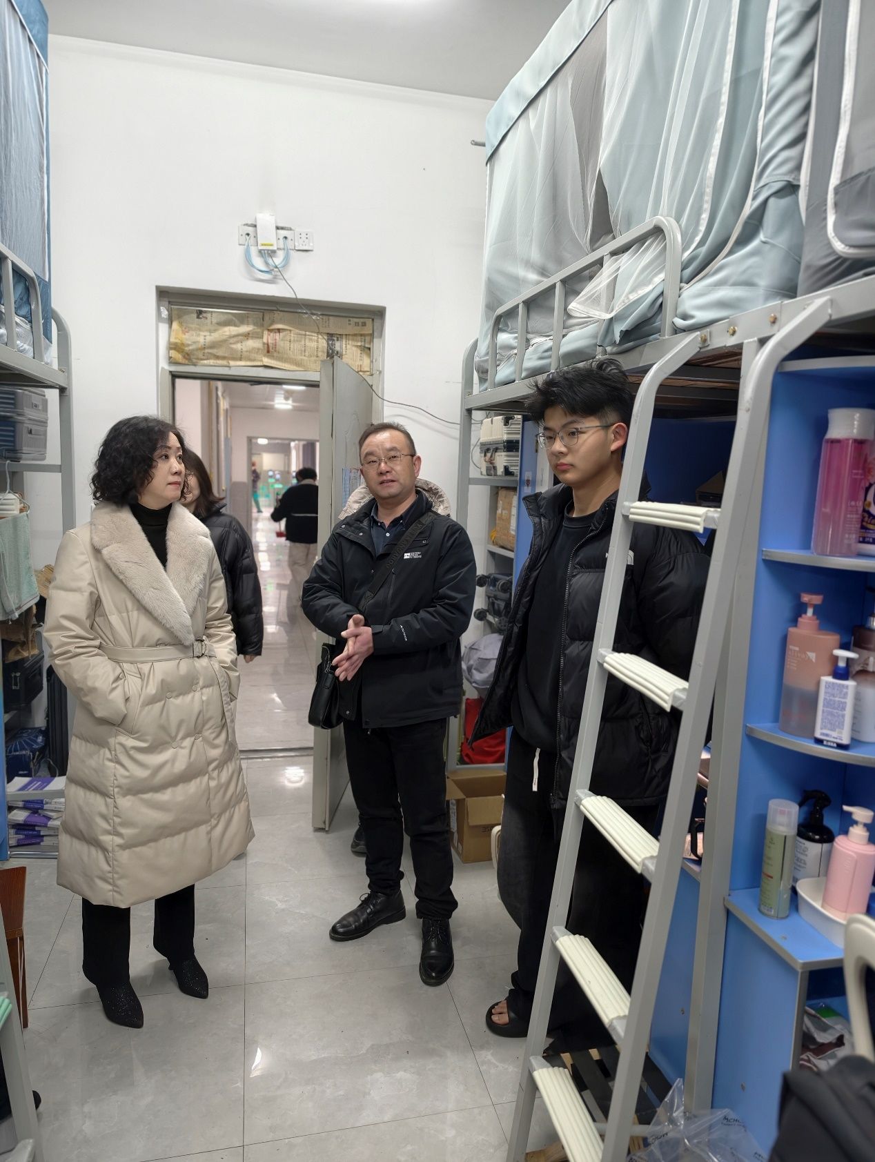 走访过程中,杨陵郧与同学们亲切交谈,详细询问大家的返校适应情况、新学期学习规划、生活需求以及宿舍氛围等,耐心倾听同学们的心声与建议。在本科生宿舍,老师们仔细查看宿舍环境卫生、安全设施及生活条件,叮嘱同学们合理规划作息、注重身心健康、遵守宿舍管理规定,在新的学期以饱满的精神状态投入到学习生活中。